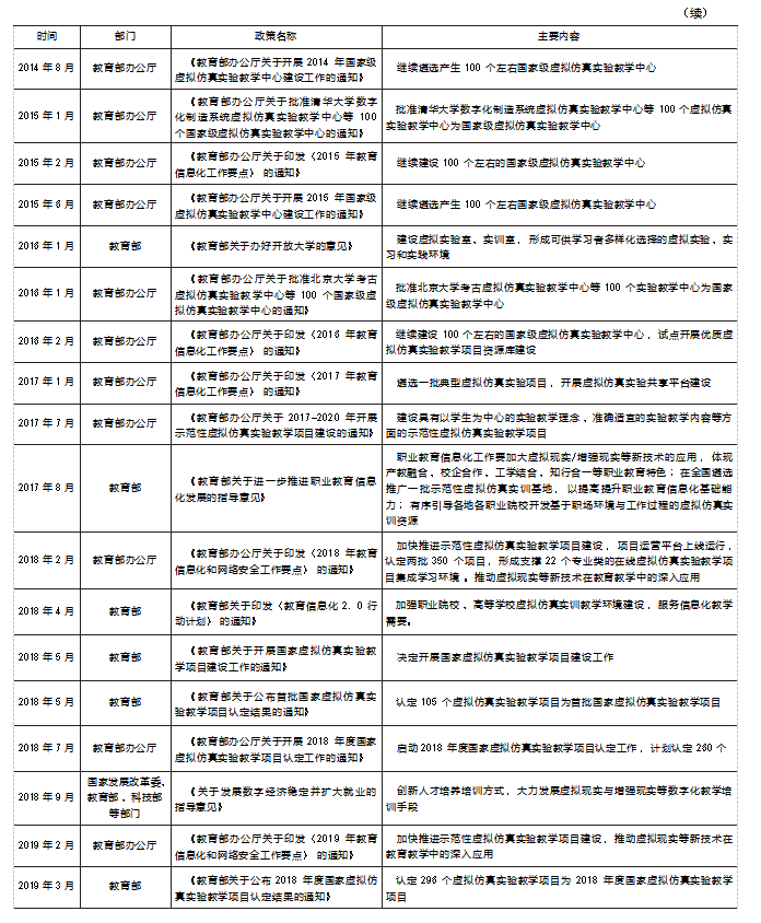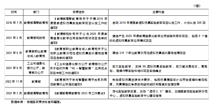 从政策层面来看,虚拟仿真教学开始于职业教育,逐渐覆盖高等教育在内的不同教育层次,已经成为教学信息化的重要工作要点(见表1)。此外,国家持续加大国家级虚拟仿真实验中心的建设力度与投入,助力实验教学和创新人才培养方式。