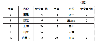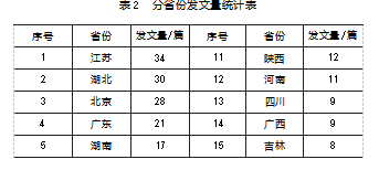 对文献的发文机构所在省份进行统计分析,发文量排名前20的省份见表2。其中,江苏在该领域的相关研究较为丰富,发文量为34篇,远高于其他大部分省份,湖北、北京、广东紧随其后。虚拟仿真实验教学采用了计算机网络技术和多媒体技术,其应用与区域信息化发展水平高度相关,而我国的数字化发展水平在区域分布上存在较大差异,根据国家互联网信息办公室发布的《数字中国发展报告(2020年)》,江苏、湖北、北京、广东、浙江、上海、福建等10个省(市)信息化发展水平位于全国第一梯队,这与表2的内容高度吻合。区域信息化的发展为虚拟仿真实验教学提供了技术支持与人才队伍,进一步促进了包括经管类学科在内的虚拟仿真实验教学研究的发展。总体来看,经管类虚拟仿真实验教学研究在空间分布上呈现较大的区域差异。