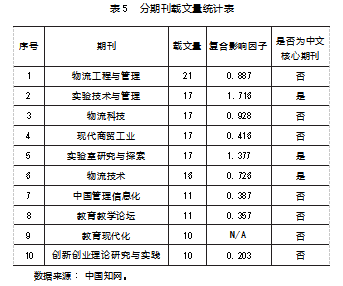 其次,从影响因子来看,《实验技术与管理》的复合影响因子最高,为1.716,其次分别为《实验室研究与探索》和《物流科技》。在该领域载文量排名前10的中文期刊中,整体影响因子较低,只有少数期刊为中文核心期刊。