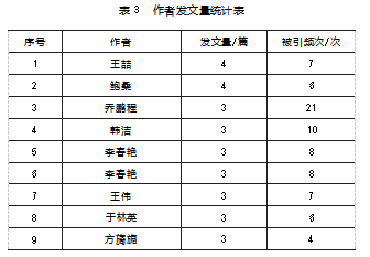 首先,从发文量与被引频次(见表3)看,作为第一作者发文量为3篇及3篇以上的有9人,平均发文量为3.22篇,平均被引频次为8.56次,其中,王喆、鲍桑发文量最高,乔鹏程被引频次最高。