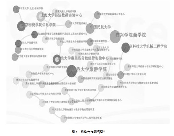 其次,研究机构合作网络。对文献数据的发文机构进行关联分析,得到机构合作网络图,反映机构之间的合作关系(见图5)。经管类虚拟仿真实验教学的研究机构覆盖面广,呈现以高等学校为主,高校与企业合作密切的特点,覆盖双一流院校、普通本科院校、高等职业院校以及企业等,为实现校企合作的经管类虚拟仿真实验教学项目的经验推广打下良好基础。这一特点也与我国虚拟仿真实验教学相关政策有关。最初相关政策针对的是虚拟仿真教学在职业教育中的应用,如2012年1月教育部发布《教育部关于开展教育信息化试点工作的通知》,强调职业院校试点中的优质资源共建共享。之后的政策逐渐覆盖高等教育在内的不同教育层次。
