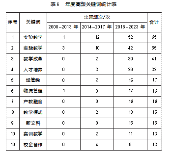 对高度概括文章主题的关键词的共现分析可以进一步探索该领域的研究热点。对出现频次排名前10的高频关键词进行分析,然后按照年度发文量趋势,整理各高频关键词分别在2008—2013年、2014—2017年、2018—2023年的出现频次,见表6。从表6可以看出,实验教学、实践教学、教学改革、人才培养等关键词是经管类虚拟仿真实验教学研究领域出现频次较高的关键词,代表了该领域的研究热点。分年度统计结果显示,这些关键词的频次在3个阶段呈现增长趋势,特别是实验教学、实践教学以及教学改革等增长态势较强,表明该领域关于教学方法和改革等主题的研究目前保持一定热度。