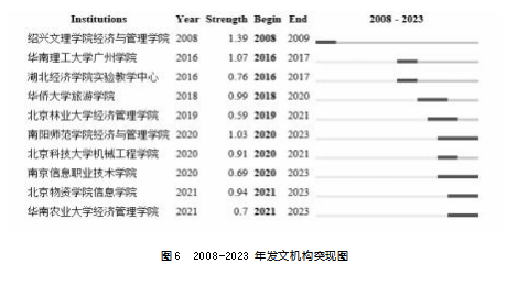 最后,研究机构突现情况(见图6)。2008—2023年排在前10位的突现机构可以发现,突现机构主要集中在2016年之后,这与图3作者突现图中显示的突显作者集中出现的时间一致。绍兴文理学院经济与管理学院(现为绍兴文理学院商学院)的冯根尧为早期研究经管类虚拟仿真教学的代表学者,而2016年之后,北京林业大学、南阳师范学院、南京信息职业技术学院、北京物资学院和华南农业大学为持续至今的突现高校,涉及双一流院校、普通本科学校和高等职业院校的多层次研究主体,成为经管类虚拟仿真教学研究的主要力量。