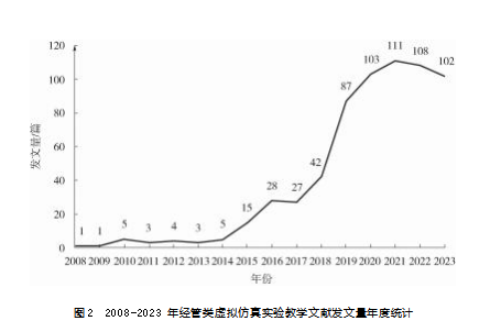 本文以2008—2023年中国知网相关数据为样本,运用CiteSpace软件,从文献发文时间、发文省份、核心作者、关键词等方面进行分析,揭示了目前我国经管类虚拟仿真实验教学的研究现状、热点与趋势,让学术界和实务界全面了解经管类虚拟仿真实验教学的研究脉络与发展,并为未来的学术研究和实践提供重要方向和启示。
