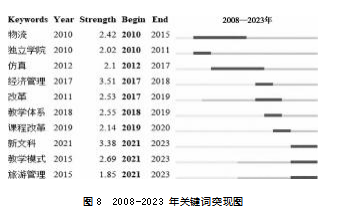 “物流”和“独立学院”的突现时间较早,其中,“物流”突现时间持续较长而“独立学院”的突现时间较短,这表明聚焦物流专业以及以独立学院为研究对象的虚拟仿真实验教学研究是早期经管类虚拟仿真实验教学研究较为热点的主题,但以独立学院为研究对象的相关研究主要集中在短期,未能进行持续研究。2008年4月,《独立学院设置与管理办法》正式实施,标志着独立学院的发展进入规范发展阶段办法施行前设立的独立学院有5年过渡期,以达到设置标准。因此,该时期针对独立学院的教学改革,学者做了大量研究与探讨[42]。