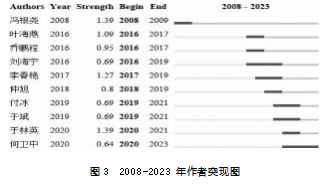 其次,核心作者突现情况。突现作者是指在短期内多次重复出现的作者。从2008—2023年排在前10位的突现作者可以发现,冯根尧为早期研究经管类虚拟仿真教学的代表学者,而突现作者主要集中在2016年之后(见图3)。其中,叶海燕、乔鹏程、刘海宁、李春艳为2016—2017年间研究经管类虚拟仿真教学的代表学者,而仲旭、付冰、于斌、于林英和何卫中为近几年来研究经管类虚拟仿真教学的代表学者。整体来看,单一学者对经管类虚拟仿真教学的研究关注度不持久,平均突现持续时间为2.7年。