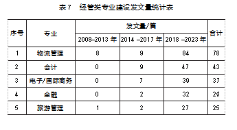 最后是经管类单专业建设维度。经管类专业涉及物流管理、旅游管理、企业管理、国际商务、市场营销、保险等专业,而现有文献主要集中在对物流管理专业虚拟仿真实验教学建设的研究上,这与我国物流行业发展迅速,物流人才需求不断增加有着密不可分的关系[32]。现有文献分别从结合物流企业特征[33]、差异化学习方式[34]、整合多系统模块[35]等多种方式对物流管理专业的虚拟仿真实验教学建设进行探讨,为培养高素质应用型物流人才提供有益借鉴。进一步对涉及的经管类专业进行发文量分析,排名前5的专业见表7,从高到低依次为物流管理、会计、电子/国际商务、金融和旅游管理,且均在2008—2013年、2014—2017年、2018—2023年这3个阶段呈上升趋势,表明这些专业的研究目前保持持续热度。