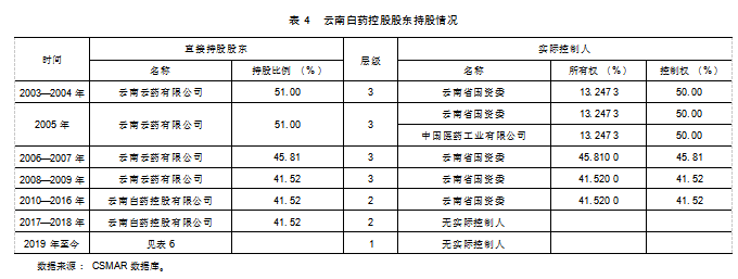 2016年以前,云南省国资委先后通过云南省医药总公司、云南省医药集团有限公司、云南云药有限公司、云南白药控股有限公司(以下简称“白药控股”),多层级间接控股云南白药(见表4)。虽然白药控股是云南白药的第一大股东,但是云南白药绝对控制权仍掌握在云南省国资委手中。加之由于白药控股母公司特殊的体制机制,公司董事会成员均由国资委直接委派任命,董事会并不具备真正的决策权。云南白药经营过程中重大事项的决策审批,仍需上报云南省国资委,层层审批的治理模式导致决策链条过长,决策效率低下。首先,这种治理结构也违背现代企业管理制度,使得公司内部治理效率低下;其次,经理人的选聘与任用也由云南省国资委委派任命,未能形成市场化的经理人进退机制;最后,政府干预下僵化的内部治理模式,导致企业缺乏对管理人员的适当激励。总之,有待改善的内部治理抑制了企业发展。