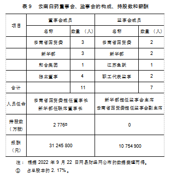 综上所述,通过引入私有产权、战略投资人、股权激励和员工持股计划、国资委多层级控股方式,云南白药混合所有制改革创新性地形成国企与民企混合、央企与地方国企混合、国企与外资混合。截至2022年6月30日云南白药前十大股东持股比例达到74.06%(见表6),多元股权结构得以构建。