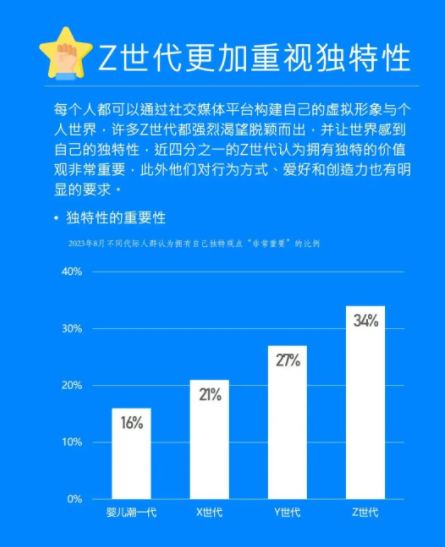 注重个性化与表达自我。Z世代很看重个性化,也喜欢通过消费表达自己。他们是在数字化时代长大的,平时就爱用消费来展现自己的身份和价值观。和上一代Y世代比起来,他们更在意有个性的消费体验,还会主动找那些能定制的产品和服务。