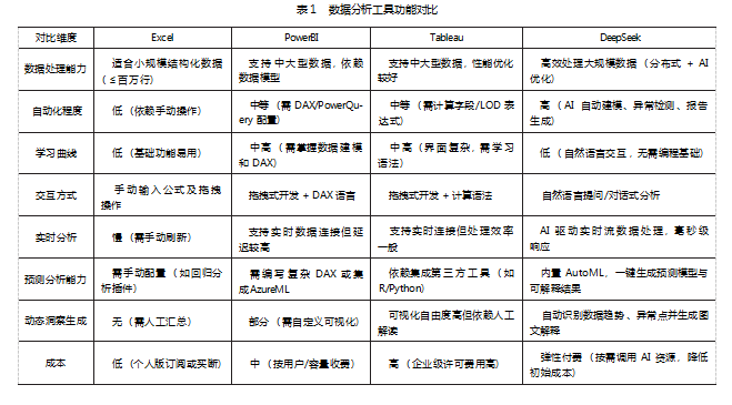 Excel、PowerBI和Tableau是当前主流的财务数据分析工具,各自在数据处理、可视化和交互性方面有独特优势,但与DeepSeek这类AI驱动的工具相比,它们存在一些不足,见表1。