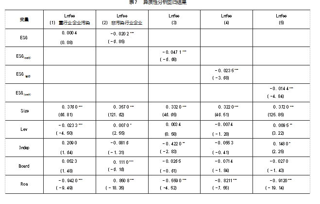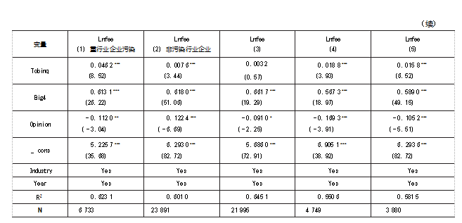 偏好降低的局面。非污染行业则由于其“绿色”属性,可能更容易吸引投资者和获得绿色金融支持。该研究将重污染行业取值为1,否则为0,并对样本数据进行行业和年度控制,结果见表7,列(1)为重污染行业,可见回归结果呈正向相关且不显著,列(2)为非污染行业,非污染企业的ESG表现与审计费用的回归系数为-0.020 2,在1%的显著水平上呈负相关,表明企业ESG表现良好,审计收费越低。然而,相比之下,污染企业组的ESG系数未达到统计显著性水平。这一差异可能源于污染企业面临更严格的环境监管和更高的违规风险,即使其ESG表现良好,仍无法有效降低审计师感知的监管风险。