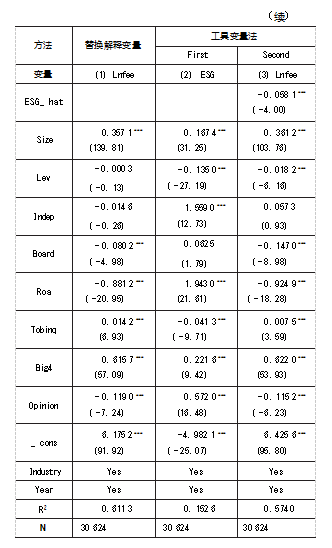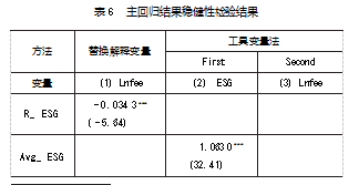 为了研究结果的可靠性以及稳健性,对主要变量进行更换,该研究对解释变量ESG评级进行重新赋分(将AAA、AA、A赋分为3,将BBB、BB、B赋分为2,将CCC、CC、C赋分为1)后命名为R_ ESG,回归分析结果见表6。见表6中第(1)列所示,R_ ESG与Lnfee仍然在1%的置信水平上负相关,这表明基准回归结果是稳健性的。