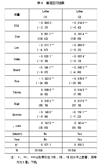 由表3的相关性分析结果可以看出,ESG表现与审计费用在1%的显著水平上呈负相关,系数为-0.135 0,进一步分析发现,融资约束与审计费用的相关系数为0.165 1,在1%的显著水平上呈正相关。综合以上分析,初步验证了假设1的有效性,其他的控制变量与审计费用以及ESG表现也都存在着显著性,表明了控制变量选取的适当性。