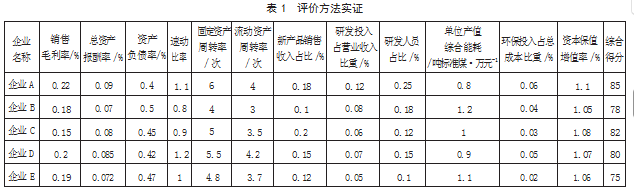 基于前期构建的科学指标体系以及精心确定的权重,本次采用功效系数法展开综合评价,并取5家企业参数。以一家典型的汽车零部件制造企业A为例,其销售毛利率达到22%,显示出产品在市场上具备一定的盈利优势;总资产报酬率9%,意味着资产利用效率尚可;资产负债率40%处于较为稳健的区间,速动比率1.1保障了短期偿债能力;固定资产周转率6次以及流动资产周转率4次,反映出资产的运营周转高效;新产品销售收入占比18%,体现了一定的创新成果转化能力;资本保值增值率110%,表明企业资本实现了增值。研发投入占比12%远超行业平均,大力投入研发实验室建设、引进高端人才、探索前沿技术,研发人员占25%。节能减排效果突出,单位产值综合能耗0.8吨标准煤/万元产值,靠设备与管理降成本,环保投入占总成本6%,建设施、推清洁工艺,实现双效益,功效系数法算出综合得分85分(满分100分),如表1所示。
