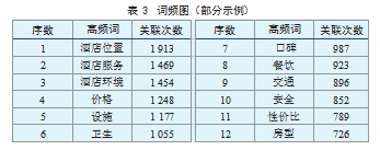 本研究通过Excel与SPSSAU软件对去哪儿旅行平台的在线评论进行频数统计,重点分析顾客来源地分布与感知价值维度。数据显示,北京(1 597条)、江浙沪(3 244条)、四川(2 560条)、陕西(5 331条)构成主要客源市场,其中陕西地区评论量占比达37.6%,表明西安作为文化旅游目的地的市场吸引力很强。典型案例分析显示,顾客高度关注文化体验要素,如西安某酒店通过“自有博物馆+曲江景区联动”模式获得9.4分好评,其文化沉浸感与亲子互动性成为核心竞争力;另一酒店依托大唐不夜城区位优势及套房升级服务,实现服务响应速度和房型满意度的双提升。同时利用微词云进行语义网络分析,得到100个高频词,由于篇幅有限,仅显示前12个。如表3所示,酒店为核心节点,其关联度最高的前3位要素为:酒店位置(1 913次)、酒店服务(1 469次)、酒店环境(1 454次),构成顾客价值感知的三维核心。进一步分析发现,“推荐”与“体验”形成强关联,表明顾客决策具有显著的口碑传播特征。地域文化符号如“大雁塔”“大唐不夜城”高频出现,验证了文化主题酒店的空间叙事效能。情感语义网络显示,“服务”节点与“热情”“周到”形成正向强关联,“环境”节点与“古色古香”“典雅”显著相关,“便利”节点与“地理位置”“交通”高度耦合。这表明顾客感知价值体系呈现多维度协同特征:环境价值、便利价值、服务价值、情感价值构成完整的价值评估模型。研究验证了文化主题酒店的价值创造逻辑:通过文化符号具象化、服务流程标准化、区位资源整合的三维策略,可有效提升顾客感知价值。数据显示,文化元素植入度高的酒店在文化体验维度评分上显著高于普通酒店,验证了文化渗透对价值感知的正向影响。