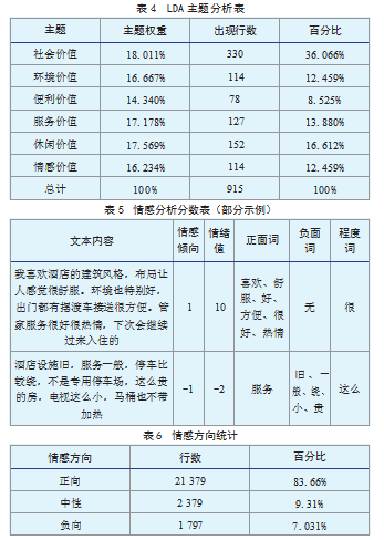 基于预处理文本数据,运用SPSSAU平台进行LDA主题模型分析(见表4),结果显示顾客感知价值呈现结构化特征:社会价值、服务价值与休闲价值为核心维度,环境价值、情感价值及文化价值共同构成六大价值体系,均值达16.66%。数据表明,顾客对酒店的差异化文化体验与沉浸式服务品质存在明确诉求,其决策动机高度依赖文化新奇性引发的社交传播效应,并强调卫生保障(基础层)、温馨服务(品质层)及个性方案(增值层)的三级服务体系构建。进一步通过微词云工具建立情感词库,设定分级赋分规则,如“非常不好=-3”至“非常好=3”,并扩展同义词组如“好”关联14类近义词,提升情感识别精度。以典型评论“服务特别好,工作人员热心且面带微笑,院子有特色,但餐品一般”为例,其情感倾向值为1,情绪得分10,识别出6个积极词“特别、热心、特色”等及1个消极词“一般”。全量数据分析显示(见表5、表6),顾客评价呈现显著正向分布:积极评价占比83.66%,中性9.31%,消极仅7.03%,印证文化主题酒店在氛围营造、服务响应等维度的优势。但消极反馈集中于设施陈旧、服务态度与地理位置三大短板,需针对性优化。