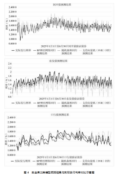 本文基于2019年1月—2024年12月的政金债发行数据,整合宏观经济、资金供给、债券要素三大维度的17项核心指标,构建了BP神经网络回归、随机森林回归及支持向量机(SVR)回归3种机器学习模型,对政金债发行利率进行预测研究,并以2025年上半年实际数据验证模型效果,得出以下结论:
