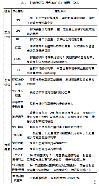 在债券发行利率的定价逻辑中,宏观经济、资金供给和债券要素等3个维度的17个核心指标共同构成了影响因素体系,每个指标通过不同机制影响发行利率。具体分类及影响逻辑见表2。
