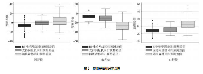 3种回归模型预测误差的箱线图见图5,反映出不同模型预测值与实际值的偏差情况。随机森林回归的箱子窄、中位数接近0、须线短,反映出该模型误差小且集中;BP神经网络回归模型箱子宽、中位数稍偏离0,须线相对长,有部分离群点,反映出误差离散程度大,虽多数情况误差不大,但偶尔会出现较大误差;支持向量机(SVR)回归模型箱子最宽、中位数偏离0,须线最长,离群点多,反映出该模型的误差最大、波动最剧烈,预测最不稳定,极端偏差频繁出现。