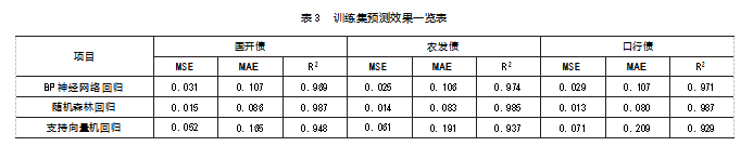 3类债券在3种回归模型下预测差值有一定差异(见表4)。国开债因数据规律稳定与随机森林适配性高而最优;农发债剔除浮息债后,BP神经网络更贴合固定利率债的规律;口行债则因数据不足导致模型表现矛盾。