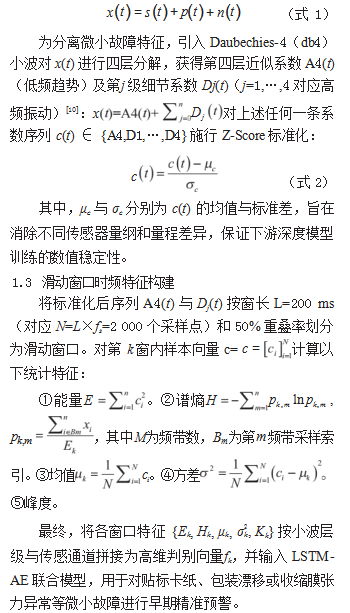 为此,本文提出一种基于自编码学习的烟草包装机械状态感知及预警架构,旨在辅助构建智能在线监测系统,主要包含三个方面:首先,通过多传感器数据融合与特征提取模块,对振动、电流和张力多个通道的时序信号进行小波分解与标准化预处理,实现对细微信号特征的高保真提取。其次,以自编码器与长短期记忆网络组合(LSTM-AE)的深度模型在仅依赖设备正常运行数据的前提下学习“正常—异常”状态的深层表征,无须故障标签即可完成模式识别。最后,通过在线预警策略对重构误差和预测残差实施动态阈值判断,输出具备可解释性的异常评分指标,用于实时检测并精准预警微小故障。
