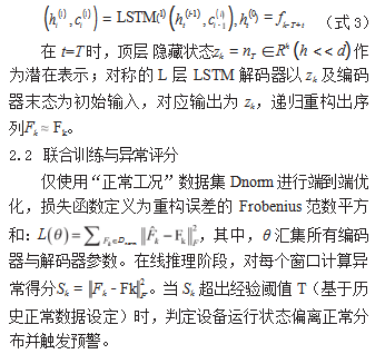 本文的LSTM-AE(可由多层组成)的在线预警架构:如图2所示,编码器以滑动窗口时频特征序列为输入,层层提炼并输出低维潜在表示,解码器则基于该潜在表示重构原始序列,将正常工况流形内嵌于网络。模型仅以正常数据训练,通过最小化重构误差在线量化异常偏离,并结合动态阈值触发MES预警,实现微小故障的高灵敏检测与精准响应,显著提升包装机械可用率与生产效率。