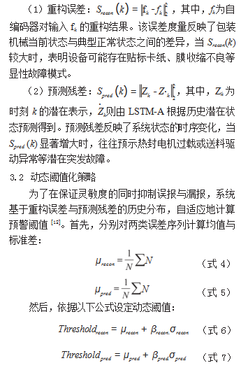 在烟草包装机械的生产现场,为保障设备高效、稳定运行并最大程度降低因突发故障(如贴标卡纸、热封失效或膜张力异常)引发的计划外停机损失。基于动态阈值的包装机械在线预警策略综合利用重构误差与预测残差,并通过动态阈值自适应调整[11],实现对包装机械运行状态的实时异常检测,以确保生产线持续、可靠地运转。
