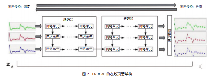 在状态感知与异常检测系统中,LSTM-AE处理来自“多传感器融合与小波时频特征提取”模块的高维输入向量fk。