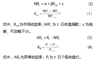 在事件研究法中,由事件发生日确定事件窗口期(多为发生日前后各延长一段时间),根据估计期(如窗口期前120天)个股收益率与市场收益率的相关关系得出窗口期内的预期收益率。异常收益率为实际收益率与预期收益率作差得出,累计异常收益率(Cu-mulative abnormal return,CAR)由异常收益率求和得到。具体模型见式(1)至式(4)。