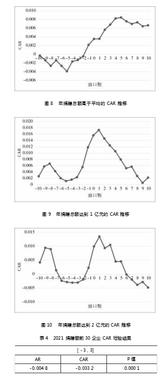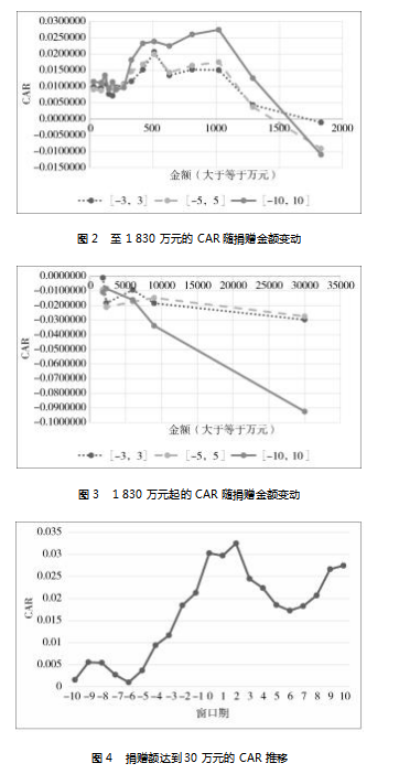 在所有3个窗口期内,CAR值都从1 020万元起显著下降,并在单次捐赠额到达1 830万元时转为负数。
