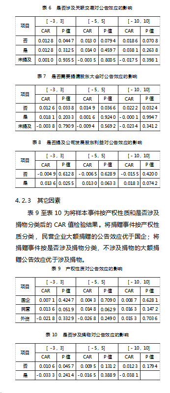 表6至表8分别为为将样本事件按是否为关联交易、是否需要提请股东大会审议和是否提及“不会影响公司发展”“不会影响中小股东利益”等语分类后的CAR检验结果。由表可知,不涉及关联交易和不需提请股东大会审议会比涉及关联交易和需要提请股东大会审议带来更正面的公告效应。而不提及是否涉及关联交易、不提及是否需要提请股东大会审议带来的CAR值最低,对公告效应的影响最差。提及捐赠事件对公司发展的影响也比不提及有更优的公告效应。说明企业对中小股东知情权的尊重应当在捐赠公告中恰当地体现出来,无论措辞与程序如何,不披露引起的资本市场反馈是最差的。