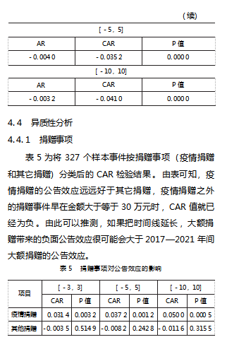 由表可知,将单独发布具体捐赠事件公告替换为发布年度《社会责任报告》后,假设依然成立,CAR值仍会随捐赠金额增加而减小甚至降为负数。