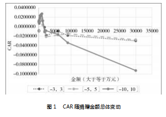 由图3可知,当单次捐赠额到达1 830万元时,总体CAR值就降至负数,且随金额的增加不断下降。当捐赠额超过3亿元时,CAR值降至-0.092 506 0。