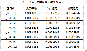 将发布《社会责任报告》中不随年报披露(即单独发布)的部分作为公告事件,使用与上节类似的方法分别选取年捐赠总额高于平均、满一亿元和满两亿元的事件计算其CAR值。表3为替换被解释变量后CAR值计算结果。
