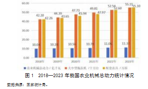 由图1可知,2018—2023年我国农业机械总动力整体呈上升趋势,2023年我国农业机械总动力已达到11.37亿千瓦,较去年增加2.8%。2023年大型拖拉机551.09万台,配套农具550.99万部。