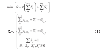 式中n为决策单元个数,每个决策单元有m个输入变量和s个输出变量;yi,j为第j个决策单元第i个输出指标值;yi,j0为第j0个决策单元第i输出值;λj为输入和输出权重;θ为决策单元有效值;Si-、S为输入和输出松弛变量;ε为非阿基米德无穷小量。