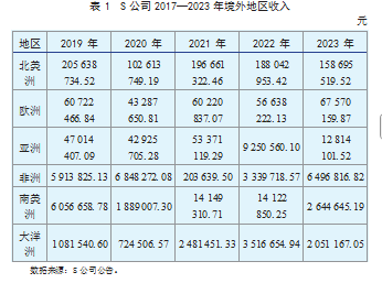 如表1所示,2023年,占S公司境外收入总额10%以上的地区有北美洲、欧洲、亚洲、非洲、南美洲和大洋洲。