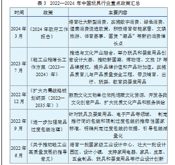 2022年以来,国家发布《轻工业稳增长工作方案(2023—2024年)》《扩大内需战略规划纲要(2022—2035年)》等一系列政策,在保障玩具产品质量的同时,鼓励玩具企业提升产品创新能力[6]。2022—2024年中国玩具行业重点政策汇总解读如表3所示。