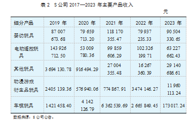 S公司的主要业务是各类玩具的研发设计、生产与销售,主要产品包括电动遥控玩具、婴幼玩具、车模玩具、动漫游戏衍生品玩具和其他玩具。按照2023年销售额进行排序,从高到低依次为婴幼玩具、电动遥控玩具、其他玩具、动漫游戏衍生品玩具和车模玩具。如表2所示。