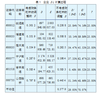 β系数是衡量企业相对于资本市场整体回报的风险溢价程度,也用来衡量个别股票包括股市价格波动在内的整个经济环境影响程度指标。由于企业目前为非上市公司,一般情况下难以直接对其测算出该系数指标值,故本次通过选择与企业处于同行业的可比公司于评估基准日β系数的平均值作为参照。综合考虑可比公司与企业在业务类型、企业规模、盈利能力、成长性、行业竞争力、企业发展阶段等多方面可比性,最终选取了7家可比公司。7家公司均属于交通运输-高速公路行业,根据Wind系统公布的BETA计算器计算可比公司βL,并按上述公式计算得到可比公司βU(见表1)。