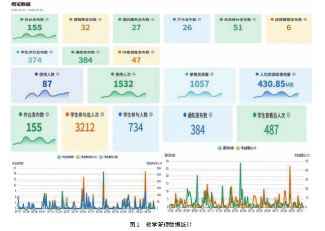 形成“学校主导、家长参与、数据支撑”的共育新生态。基于国家智慧中小学教育平台和人人通空间整合使用,系统调控教学过程,优化教学管理模式。例如,在通知发布和作业发布两个维度,展现学校教学管理中的互动情况,体现出信息传递高效、教学活动中学生参与度高,家校实时沟通覆盖率达100%,关键信息触达响应时间缩短至24小时内完成。如图2所示。