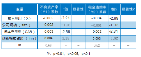 回归结果表明,技术应用程度(X)与不良资产率和租金违约率均呈显著负相关(系数分别为-0.005和-0.004),即技术应用越深入,风险水平越低。创新模式占比(Inn)与风险呈正相关,但技术应用通过负向系数有效对冲了这一风险。公司规模(Size)和资本充足率(CAR)与风险呈负相关,表明规模大、资本充足的公司抗风险能力更强。实证结果验证了技术赋能在创新模式下风险管理中的关键作用。