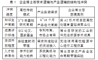 此外,当前企业博士后机制仍存在显著的结构性矛盾:31%的企业博士后在调研中表示面临“学术归属感缺失”与“企业融入壁垒”的双重焦虑;高校知识产权管理制度与企业商业秘密保护需求存在制度障碍,导致54%的联合研发项目遭遇技术转移延迟;现有考核过度侧重论文产出,忽视技术商业化价值评估,致使多数产业化研究成果未能获得应有激励,如表1所示。