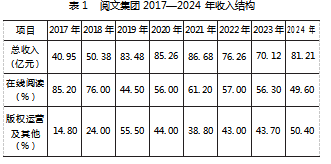 在并购发生前,阅文集团面临着严峻的战略困境,其收入结构严重失衡,见表1。2017年,公司总收入为40.95亿元,其中在线阅读业务收入占比高达85.2%,而作为未来增长引擎的版权运营业务收入占比仅为14.8%。这种单一的业务模式在面临免费阅读模式的冲击和日益猖獗的盗版问题时,显得尤为脆弱。因此,向产业链下游延伸,提升IP的影视化、商业化开发能力,是阅文集团打破发展瓶颈的必然选择。