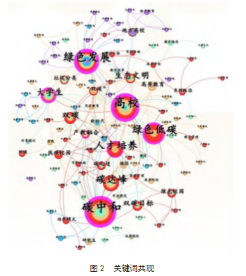图2为关键词共现分析,圆圈的大小代表关键词在文献中的共现频率。圆圈越大,表示该关键词在文献中被引用或讨论的次数越多,说明它在该研究领域中的重要性越高。由图2可以发现,“碳中和”“高校”“绿色发展”“绿色低碳”“碳达峰”“人才培养”“大学生”等关键词为主要的关键词节点。