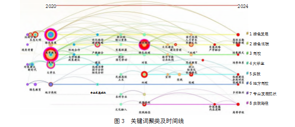 通过CiteSpace软件的时间线功能,可以将本文文献数据按照关键词聚类及研究时间线进行可视化。通过图3可以发现,本文主要关键词聚类分别为“绿色发展”“绿色低碳”“高校”“大学生”“实践”“地方高校”“专业发展路径”“实践路径”8个类别。