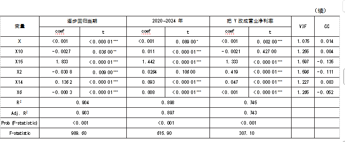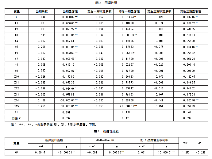 模型的F=989.60,P<0.001,说明模型整体上是非常显著的。模型的可决系数R2=0.904,修正的可决系数调整R2=0.903,说明模型的解释能力不错。为了对原方程进行检验,本文采用模型(3)对2020—2024年同样的节能环保企业数据进行检验,模型的F=615.90,P<0.001,说明模型整体上依然非常显著。模型的可决系数R2=0.898,修正的可决系数调整R2=0.897,证明该模型在时间效应上同样具有显著性。本文还用同样可以证明企业财务绩效的营业净利率用模型一进行回归,模型的F=307.1,P<0.001,模型的可决系数R2=0.745,修正的可决系数调整R2=0.743,方程显著。本文对多重线性检验使用的是方差膨胀因子判定法,各取值的VIF值均小于1.6,模型中共线性影响较小,异方差检验CC值均不超0.3的绝对值,不存在异方差影响。