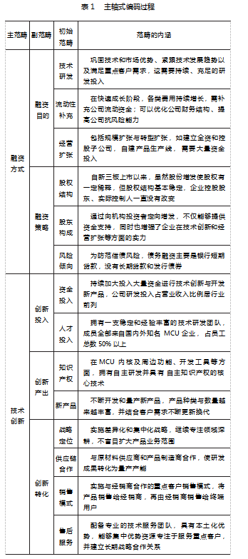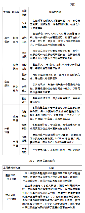 本文运用程序化扎根理论对原始资料进行编码分析,具体过程如下:首先进行开放式编码,将原始资料概念化与范畴化,通过反复比较、凝练与补充,共提炼出25个初始范畴;其次是主轴式编码,在开放式编码的基础上,依照“融资方式—技术创新—企业绩效”的思路不断分析和挖掘初始范畴之间的逻辑关系,将25个初始范畴合并为10个副范畴,并最终归纳为4个主范畴,从而形成一条具有类属关系的轴线;最后一步是选择式编码,对已建立的轴线进一步验证和分析,完善各范畴之间的逻辑关系,并用“故事线”来描述主范畴之间影响路径的演变机理。具体数据分析过程见表1和表2。理论饱和是扎根理论的一个明确特征,它依赖于不断比较分析的过程[18]。为了检验是否达到理论饱和,本文按照与之前一致的数据收集方式补充新资料,同时通过编码将资料概念化和范畴化,然后与原有资料和理论进行比较分析。结果显示,补充资料中并未能提炼出新的概念与范畴,因此可以认为本文运用程序化扎根理论所得到的研究结果已达到了理论饱和。