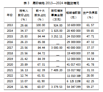 为了满足研发投入、资产流动性以及经营扩张等资金需求,晟矽微电根据自身融资策略采取了股权定向增发与银行短期贷款相结合的融资方式。晟矽微电2013年在新三板挂牌上市后,分别在2013年、2014年、2015年、2017年、2021年和2024年进行了增发股权融资,6次股权融资之后,控制人股份占比和前十大股东占比分别从29.66%和100%下降至11.96%和60.07%,股权集中度明显下降。见表3。但从公司运营来看,公司的实际控制人并没有发生改变。晟矽微电的债务融资主要集中在银行短期贷款,资产负债率先降后升。这一方面反映了企业对偿债风险的谨慎态度,避免过高的还本付息对公司资金的占用进而影响技术创新投入;另一方面也表明了在资金短缺的情况下,短期借款对公司资金链平稳运行的重要性。